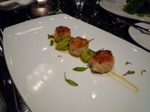 Dungeness Crab Cakes with Avocado Ragu and Lobster Sauce