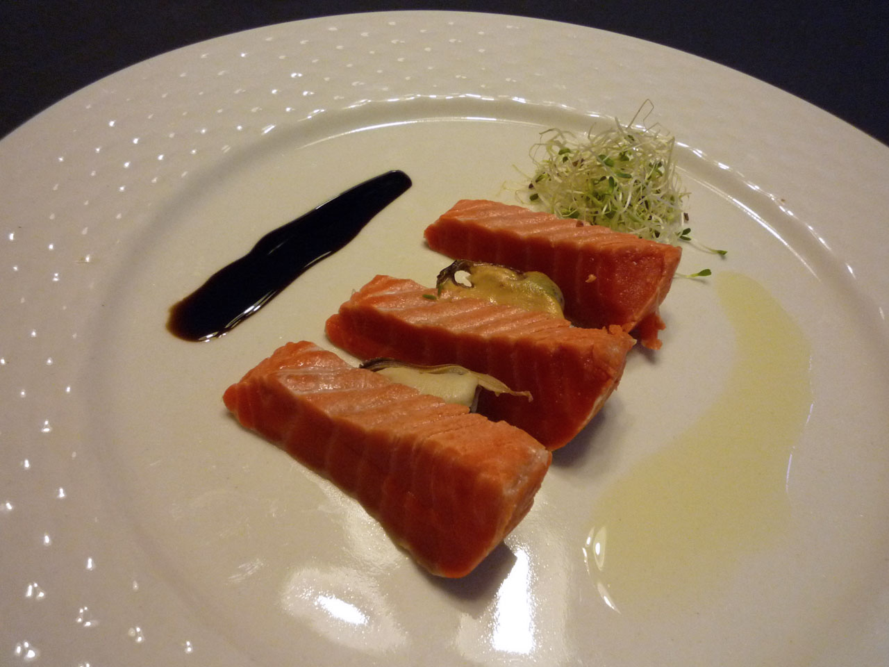 Sockeye Salmon Tataki & steamed mussel with balsamic reduction and lemon oil