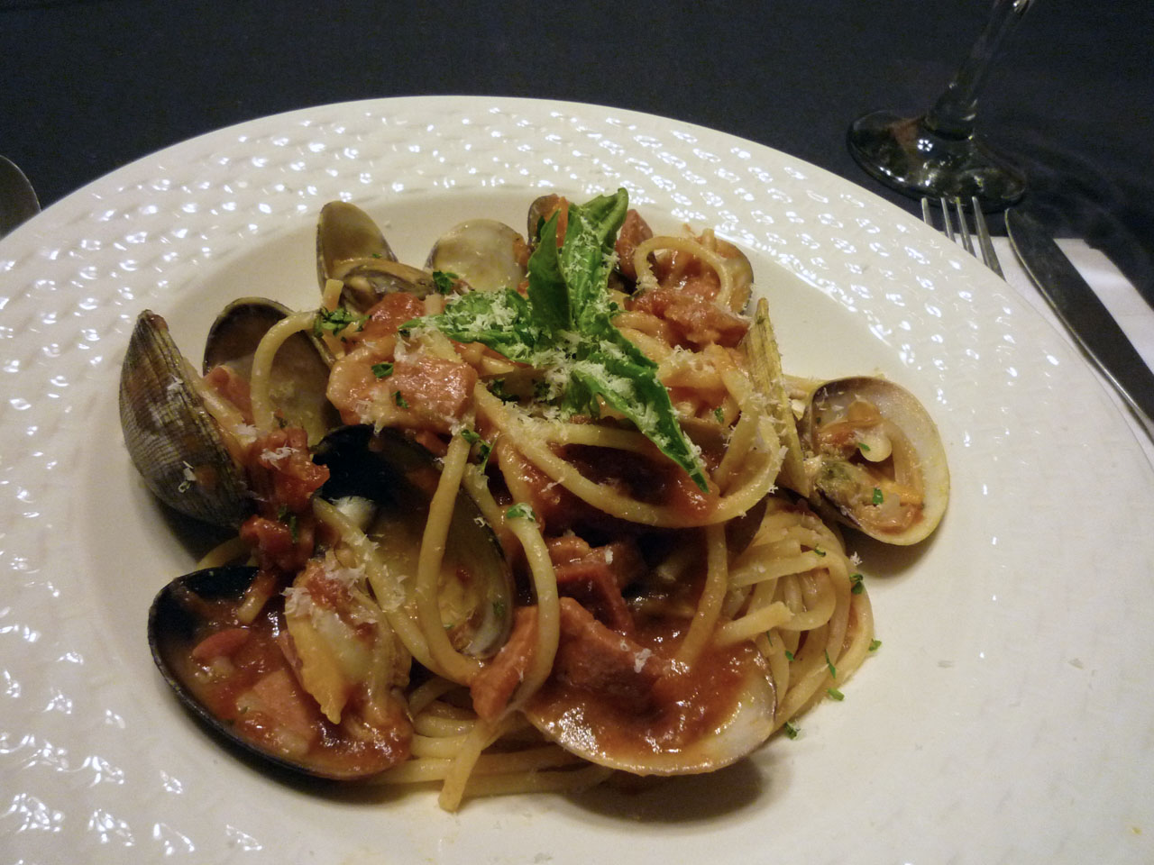Prosciutto and Manila Clam Spaghetti, with spicy tomato sauce.