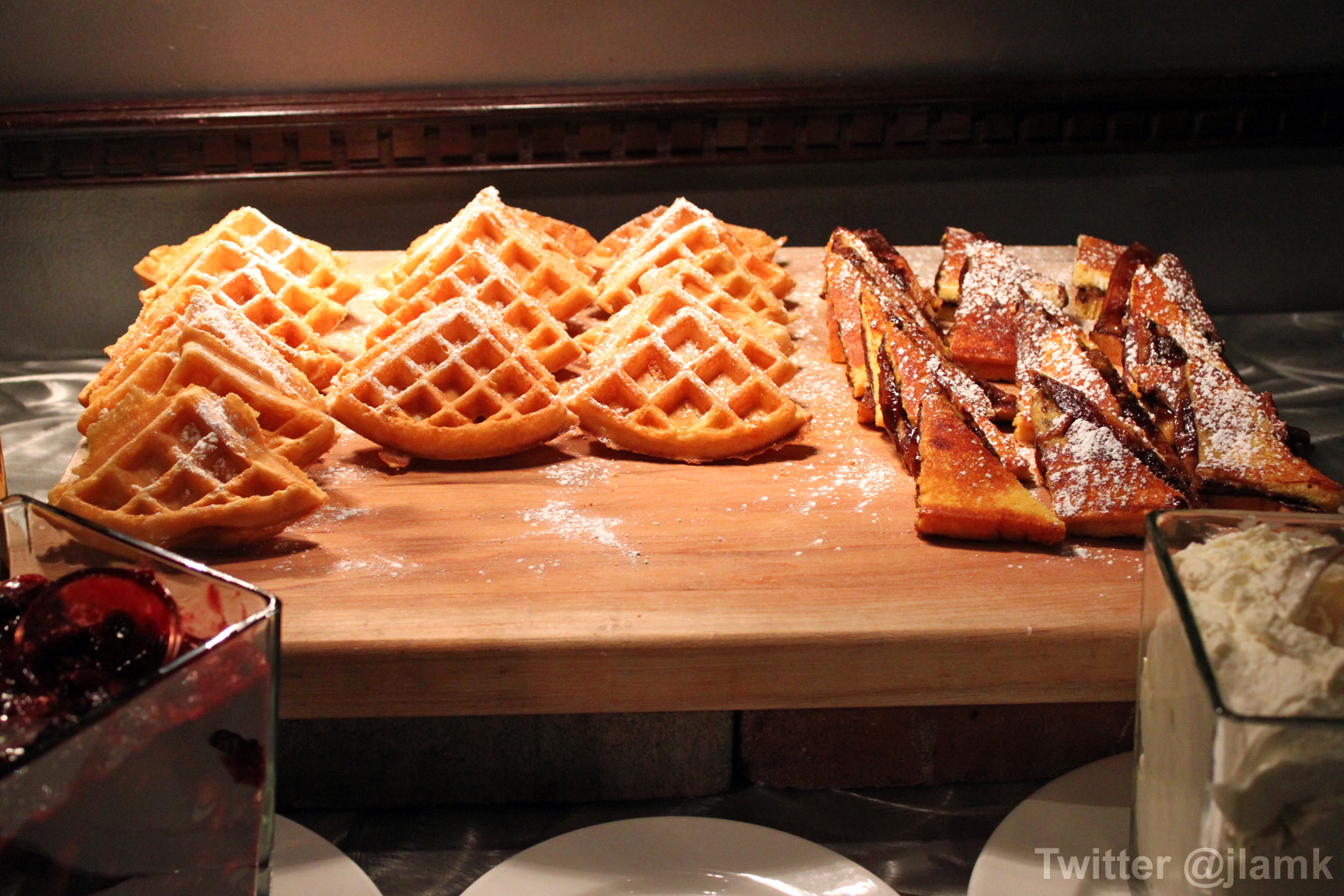 Waffles (fresh berries, maple syrup, whipped cream) and brioche sandwich (banana and chocolate)