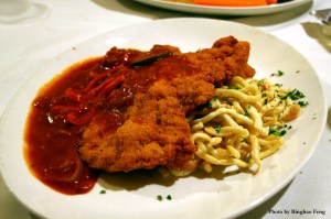 Zigeunerschnitzel: pork schnitzel, spicy gipsy sauce, spätzle
