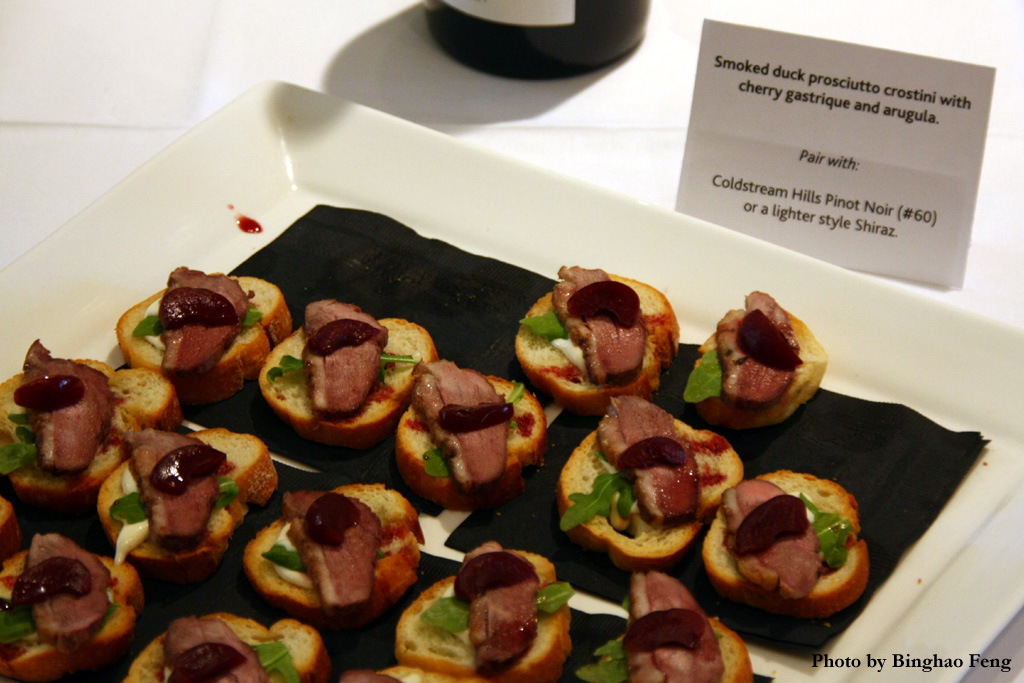 Smoked duck prosciutto crostini with cherry gastrique and arugula – Pinot Noir