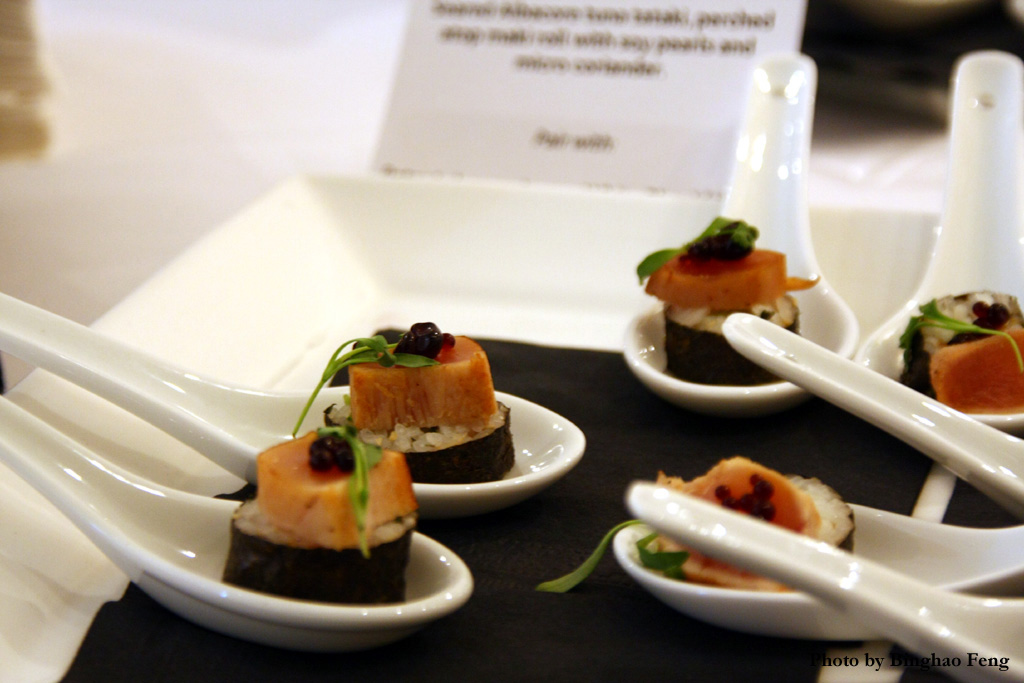 Seared albacore tuna tataki, perched atop maki roll with soy pearls and micro coriander – Riesling
