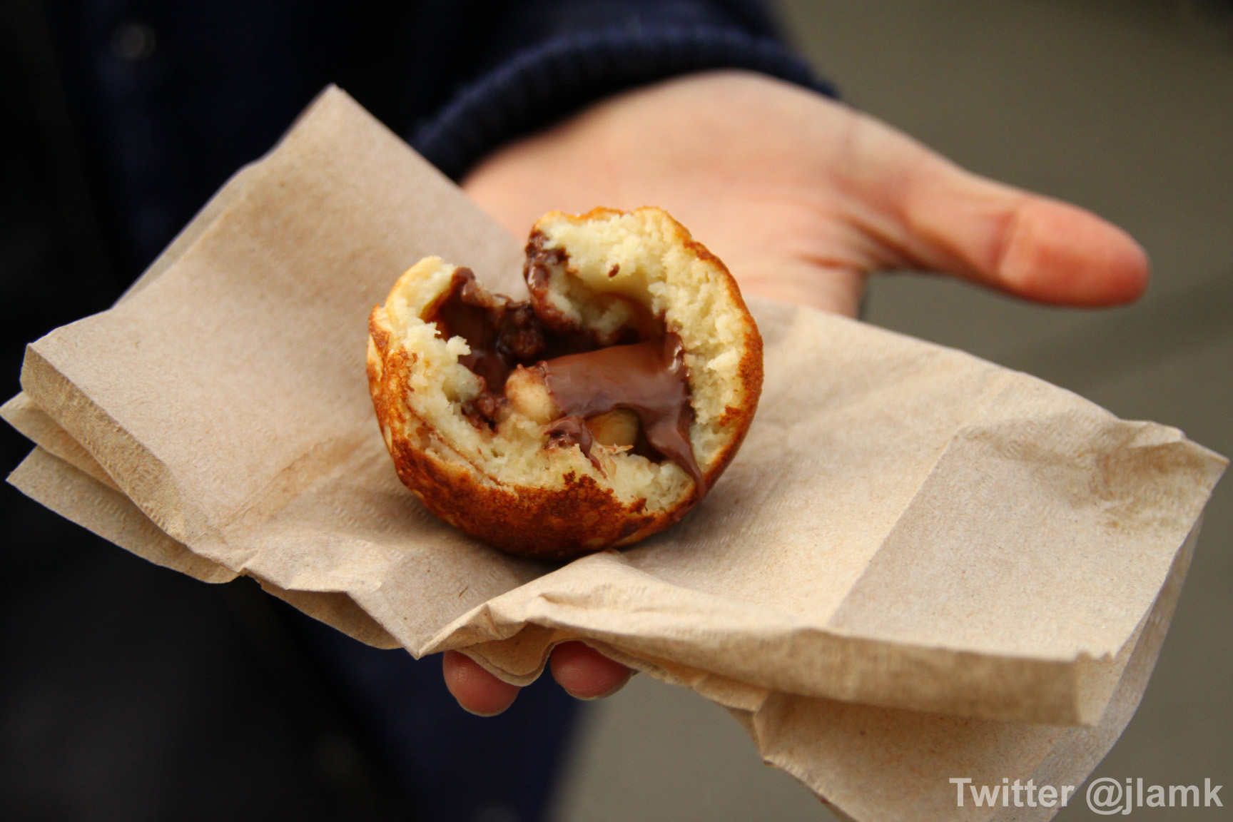Making the ebelskivers reminds me of the takoyaki booth at the night market. She poured the batter into the hot cast iron mould, and flipped the balls when they’re half-cooked. In the end, she made some hollow pancake balls and fillings were put in after the pancake balls are cooked.