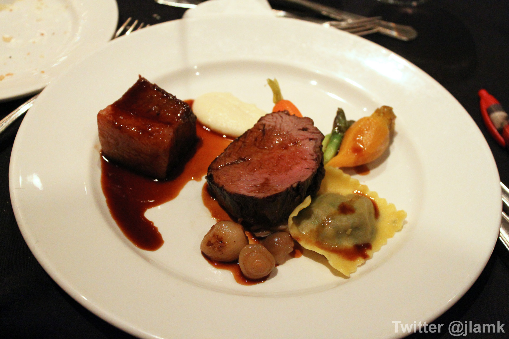 VCC: Fillet of Beef, Slowed Braised Brisket, Mushroom and Spanich Ravioli, Saute of Root Vegetables and Purees, Sherry Vinegar Jus