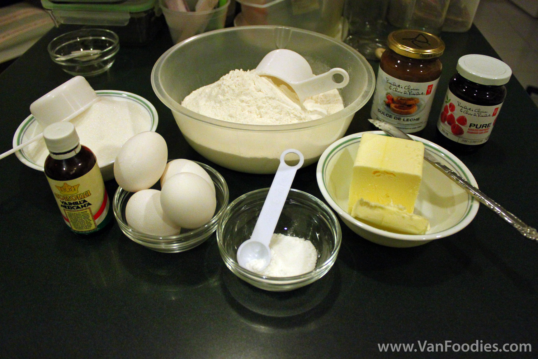 In our case, we used alphabet/number cookie cutters to spell out VanFoodies and the number 2 in the centre of half of the rounds. Then, on the back of the full rounds, we spread a layer of raspberry jam and dulce de leche, just enough so that the filling shows through when you top it with the cut-out cookies.