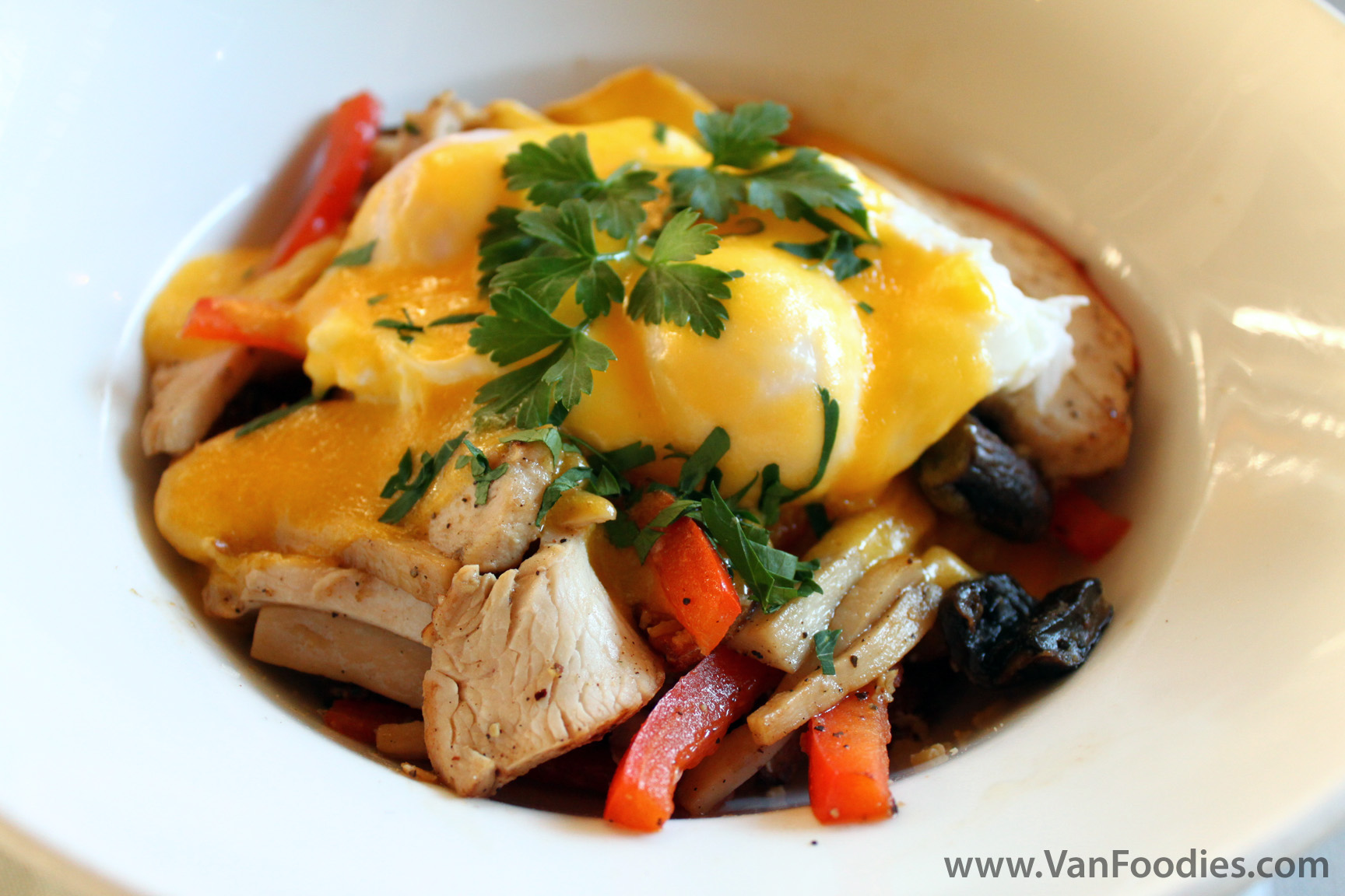 Giraffe’s hash with crisp herb potatoes, grilled chicken, sauteed wild mushrooms, peppers, smoked gouda and poached eggs with hollandaise