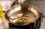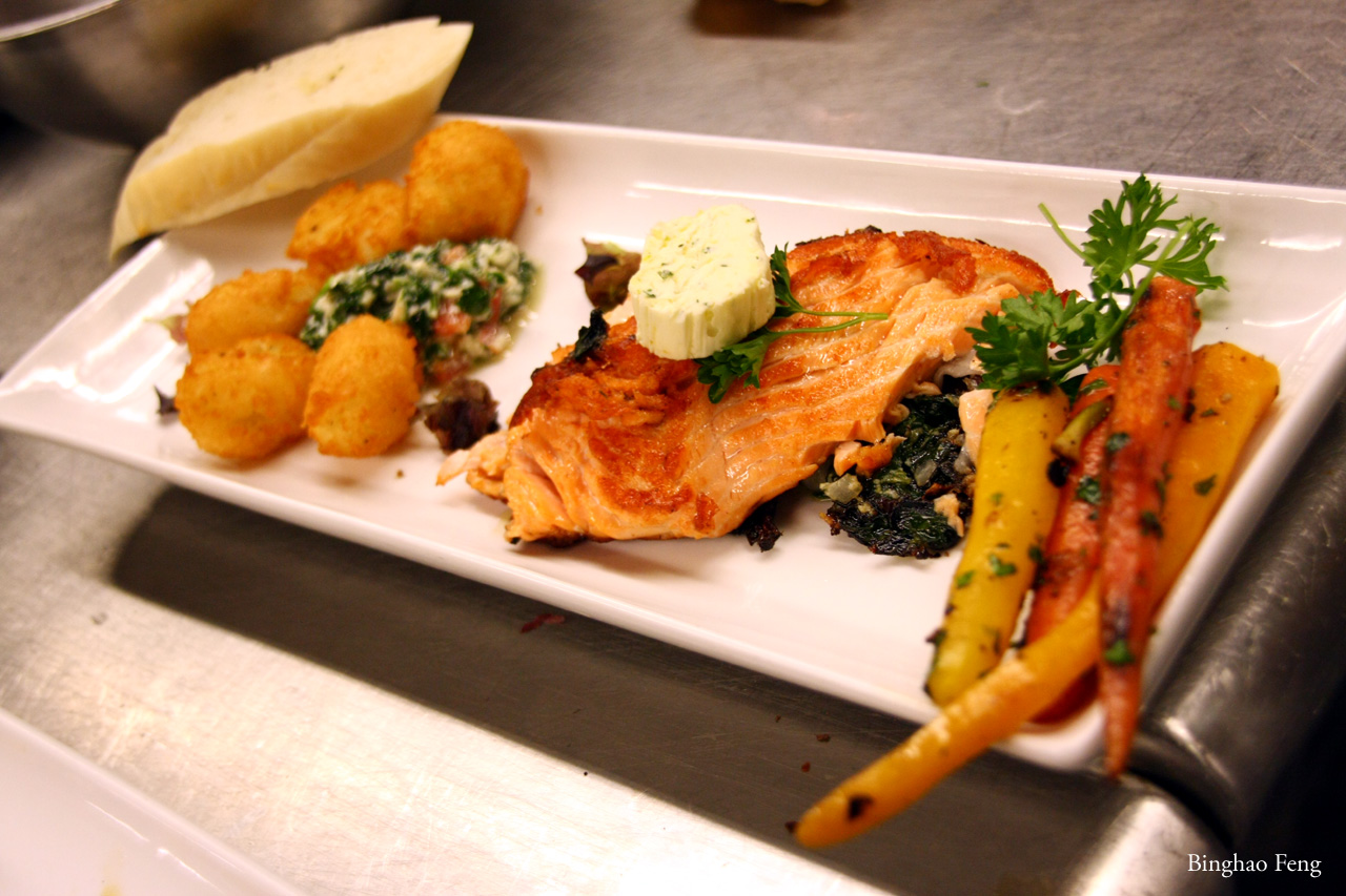 A large King Salmon was shared by the class. The chef had prepped the fish and all we had to do was to make the stuffing, stuff it, sear the salmon, and put it in the oven to finish. Like the potatoes, in the end we were left with a crispy outside and a soft flesh in the middle.