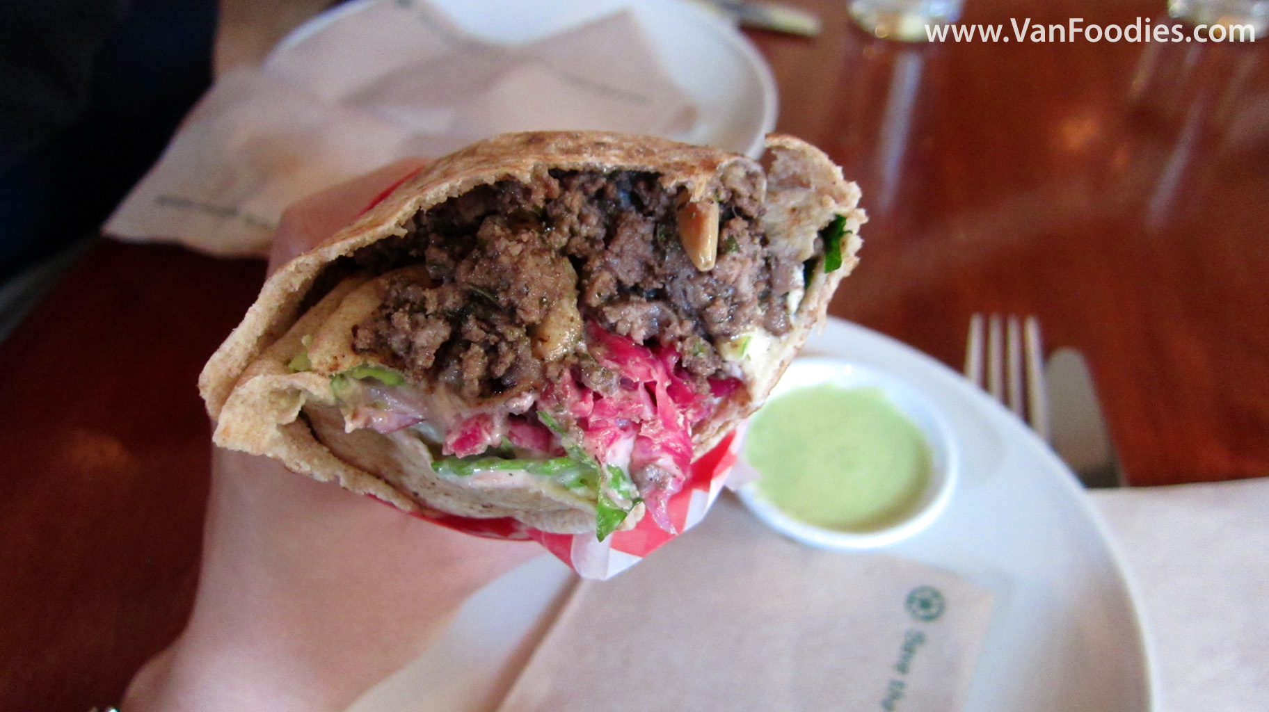 Rolled pita bread with organic greens, tomato, home made pickle, tahini and hot sauce