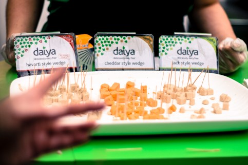 Daiya is a vegan cheese company that gave samples of both blocks of their product and how it could be used in your regular food items — great way to directly introduce a product into the consumer’s daily routines. When trying the bite-sized blocks, it gave a very generic processed cheese taste, with an odd texture. But, when put into a grilled cheese, or a toasted tortilla and melted, it’s very delicious. Strange.