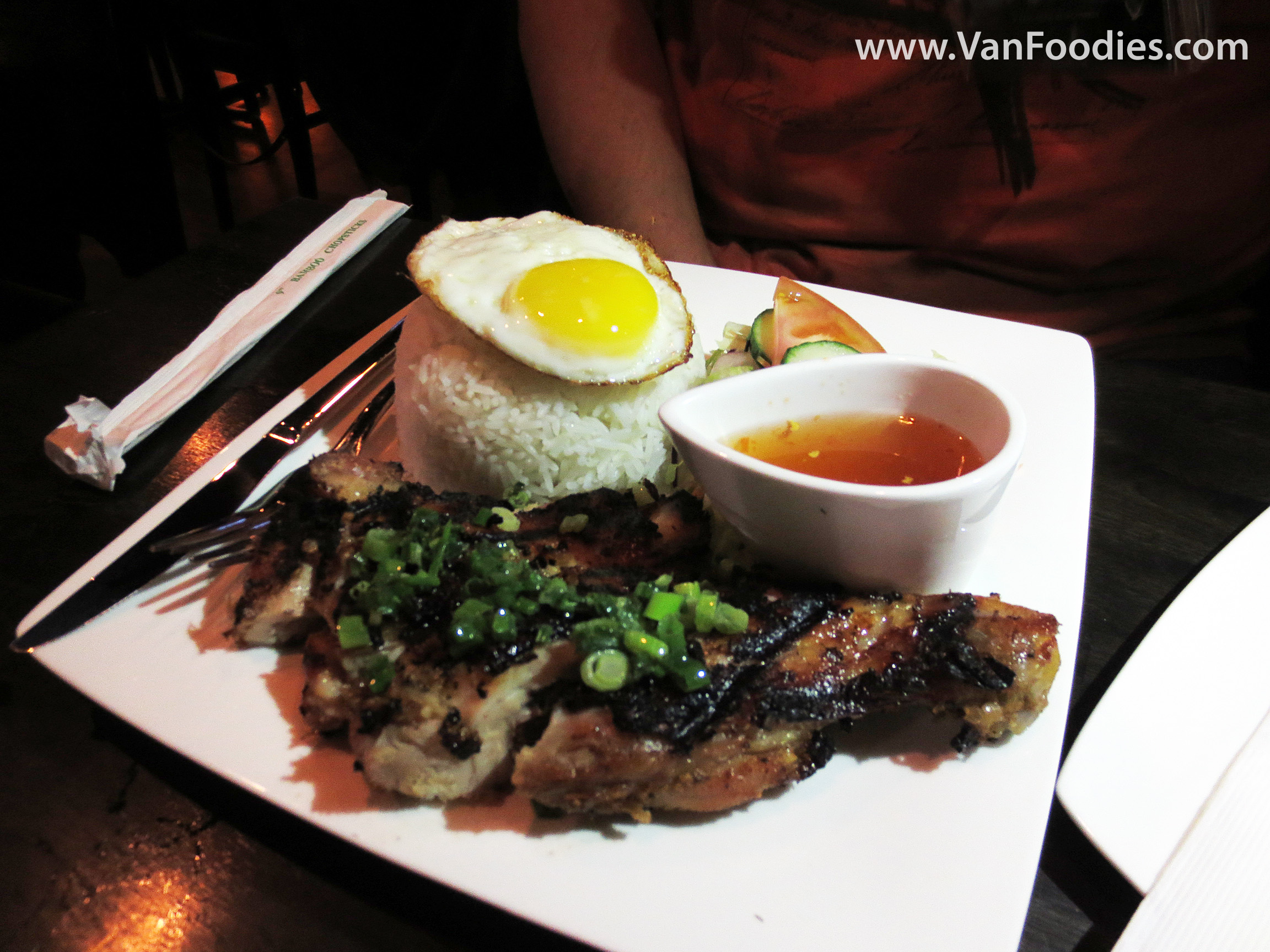 Lemongrass Chicken – Vietnamese style lemongrass grilled chicken, Vietnamese ham, and a salad of tomato and cucumber on rice with fish vinaigrette on the side.