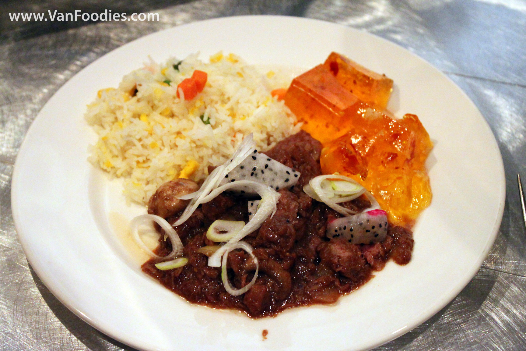 Dynasty Seafood Entree: Sirloin Beef Steak Cubes in a Mushroom Beef Gravy with Fried Rice, Peas, Long Bean, Butter and Corn, Goji Berry Jelly