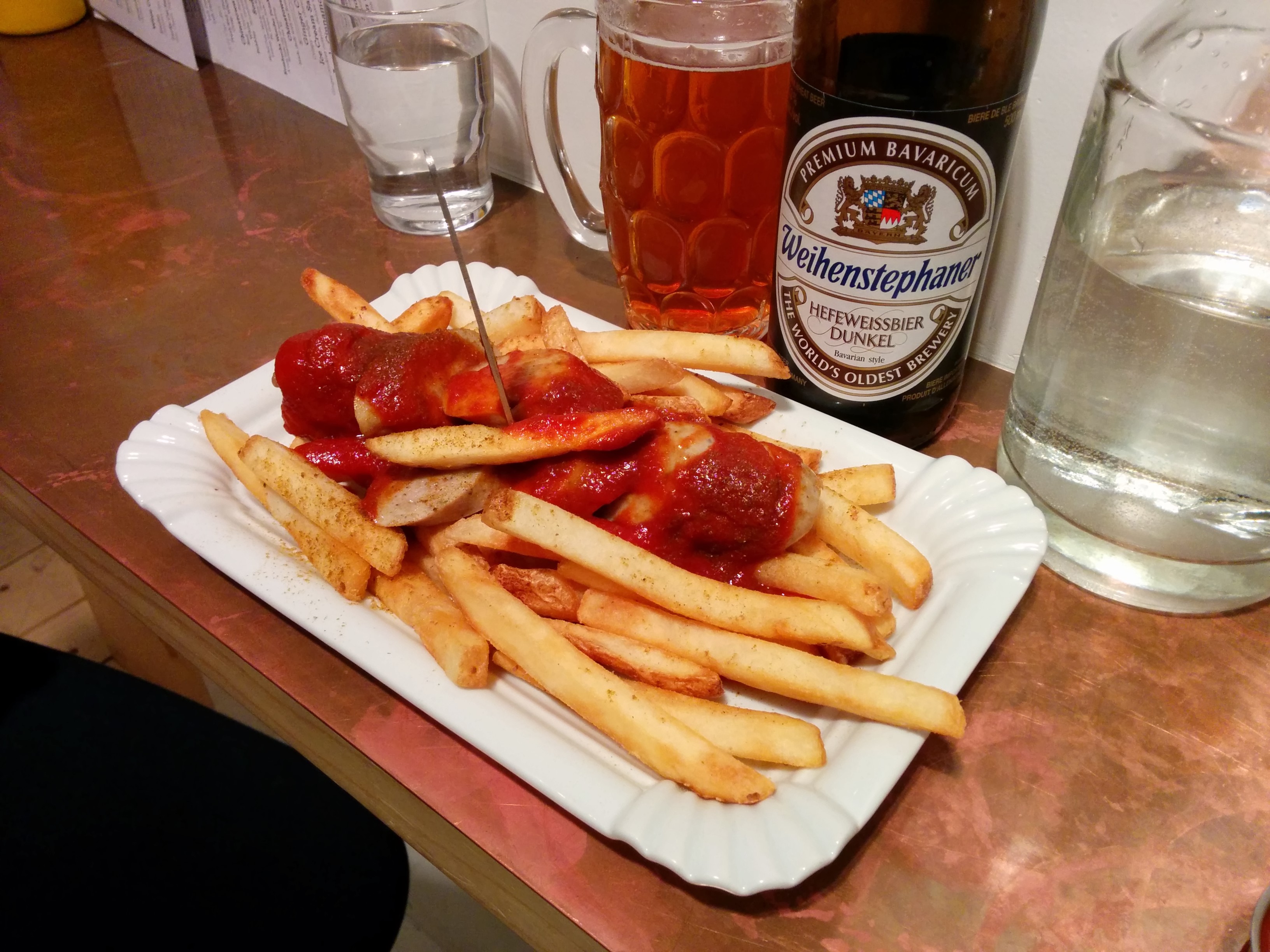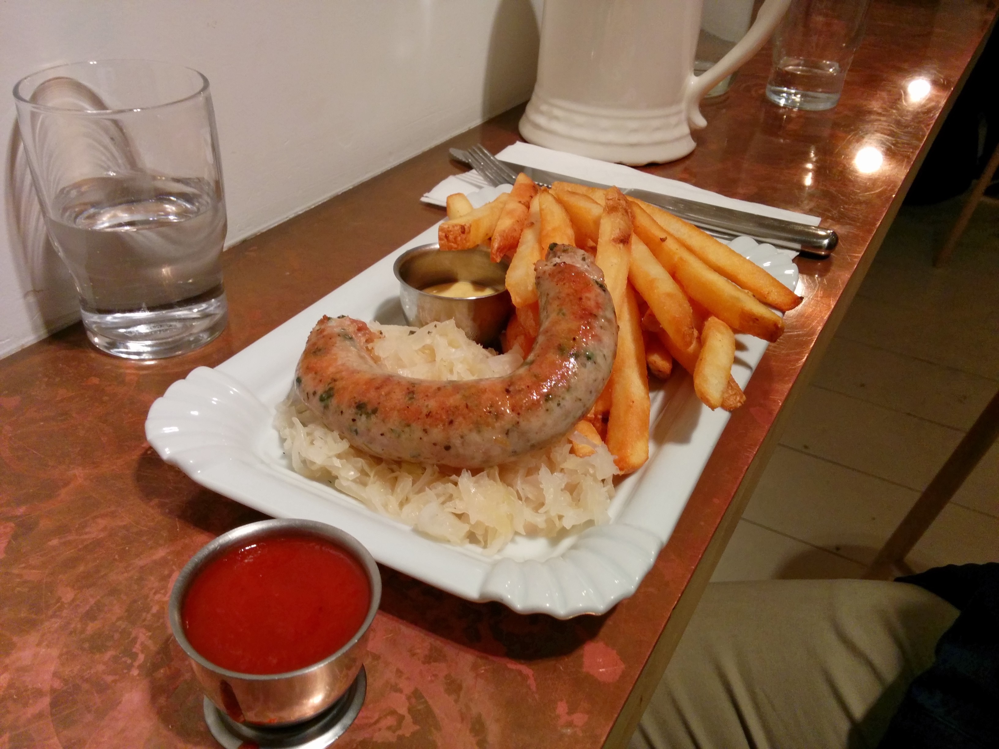 The service here was friendly, one of the staff was a bit overbearing. I came here with the bf, and they explained how their menu worked as it was our first time. There are two styles to the dishes, one is currywurst in which they slice the sausage for you and put it on top of fries with house made curry ketchup; the other is the sausage and sauerkraut where they leave the sausage whole, with fries and sauerkraut on the side.