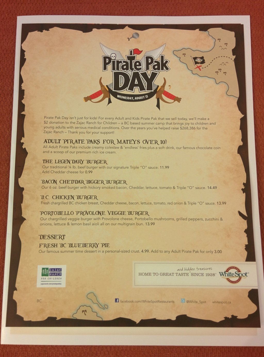 Unleash your inner child on this day and indulge in classic Pirate Pak items including the Legendary Burger, Bacon Cheddar Bigger Burger and BC Chicken Burger. For each Pirate Pak sold, White Spot will donate $2 to Zajac Ranch for Children. To-date they have raised close to 269,000 for Zajac Ranch through this initiative!