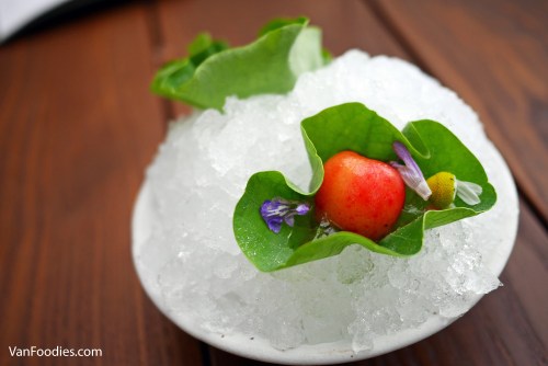Wild rainier cherry in nasturtium leaf, wild chamomile, elderflower essence — what an interesting bite. Enjoyed the crisp sweetness of rainier cherry against the herbaceous chamomile and nasturtium. The elderflower essence was made into a little dollop of jelly that combined everything.