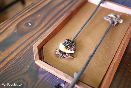 Morel mushroom skewer with young shallot from garden – the morel was buttery, not much funk/earthy taste.