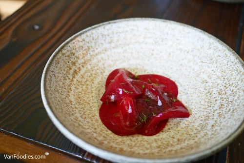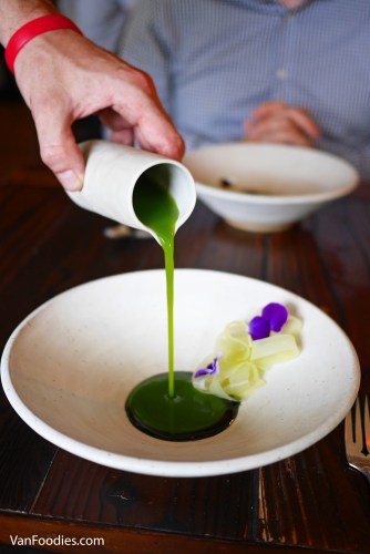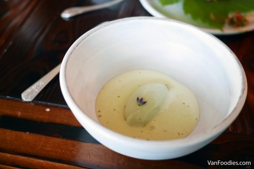 Cured rockfish, poblano peppper broth – the paper-thin rockfish had firm texture, reminded me of red snapper. The poblano pepper broth had gingery note. And there was subtle heat and gave you a kick in between bites.