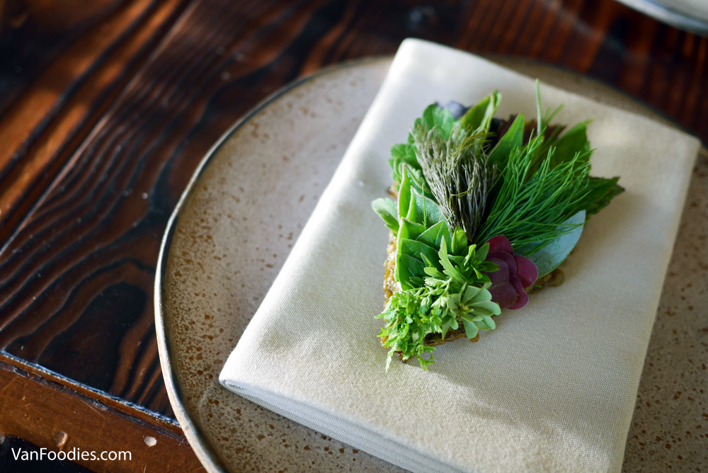 Herb tostada, mustard green base with oyster emulsion and herbs from garden — oh wow this was so beautiful, it looked like a boutonniere! The mustard green base was crispy yet not greasy, and the combination of fresh herbs was awesome. I could totally have another one.