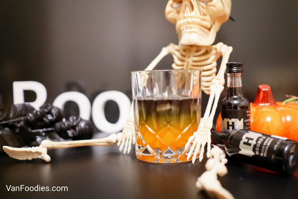 Then, add some ice cubes and top it up with Hounds Black Vodka. And voila, and black and orange cocktail for Halloween. Easy peasy, right?
