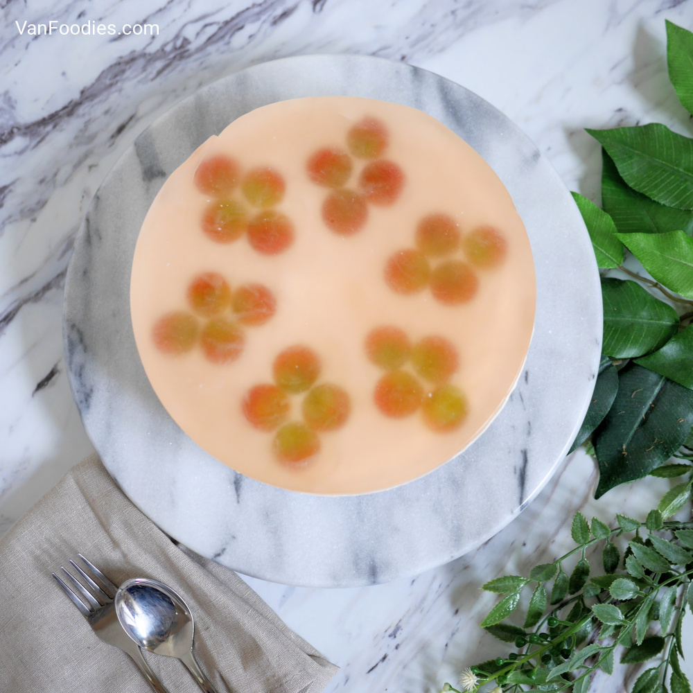 We found this cheesecake recipe that includes a jello layer on top. We sliced the grapes in half to line the outside of the cheesecake, then more grapes inside the cheesecake. Finally we put some grapes in a pattern on top, before we poured the jello layer to set. For the jello layer, it calls for fruit juice and gelatin. We picked up a pink cranberry cocktail juice that gave us some tartness and colour. The end result? A pretty pink grape cheesecake with grapes in every bite.
