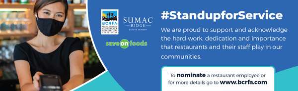 At a time when the restaurants keep getting setbacks, let’s show them we care. The BC Restaurant and Foodservice Association (BCRFA), Sumac Ridge Estate Winery, Save-On-Foods stores, and Town Hall Brands have partnered up in an initiative called #StandUpforService, where outstanding restaurant workers from across BC are recognized for their top-notch service at BCRFA.com.