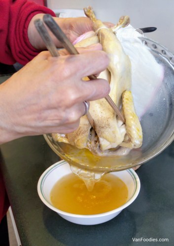 Tip: Thoroughly cleaning the cavity of the chicken prevents any blood bleeding into the chicken when steaming, ensuring a beautiful chicken broth for the sauce!