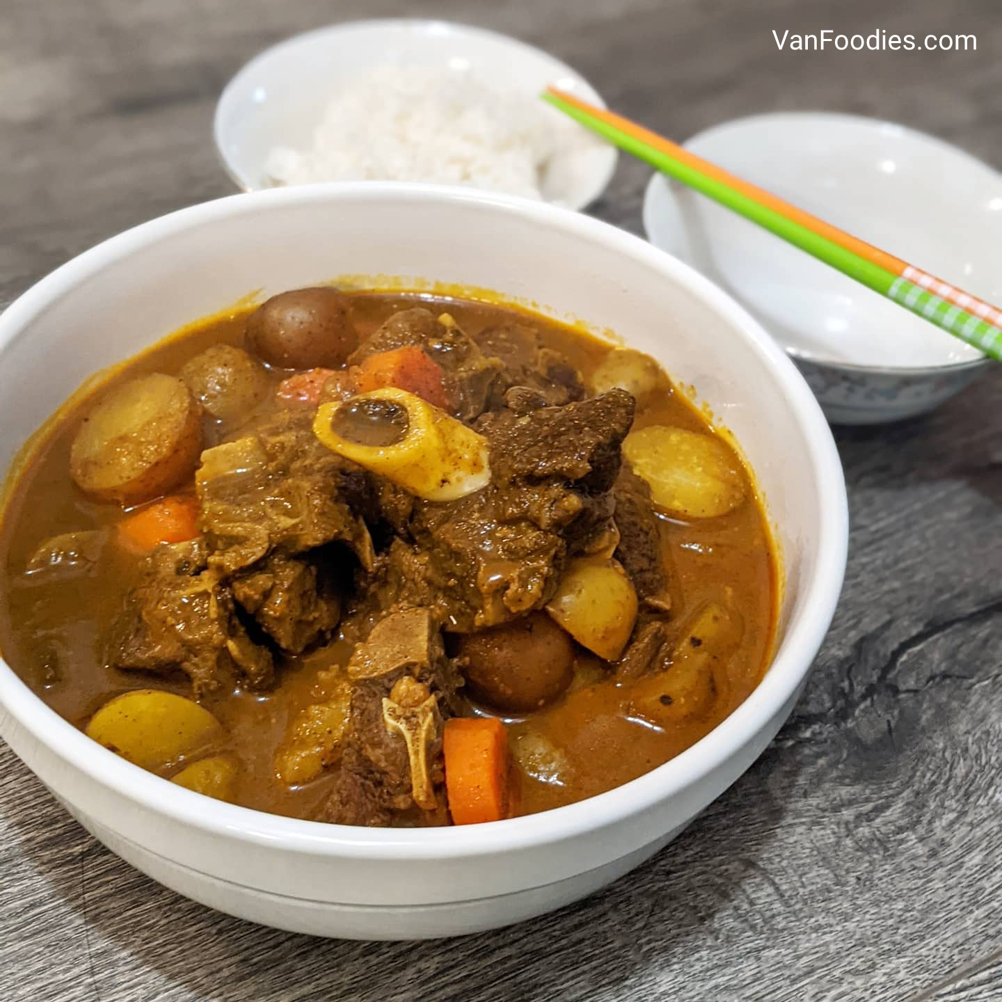 Goat Curry with Potatoes and Carrot: I quickly rinsed the goat meat, patted dry, and seasoned lightly with salt and pepper. Then I browned the goat pieces, added some onion and finely chopped garlic, then stirred in some curry powder (I used goan vindaloo masala powder from The Indian Pantry), before topping the pot with chicken broth. Brought it to a boil, then turned the heat down to a simmer for 1.5 hours. Added potatoes and carrots to cook for another 30 minutes.