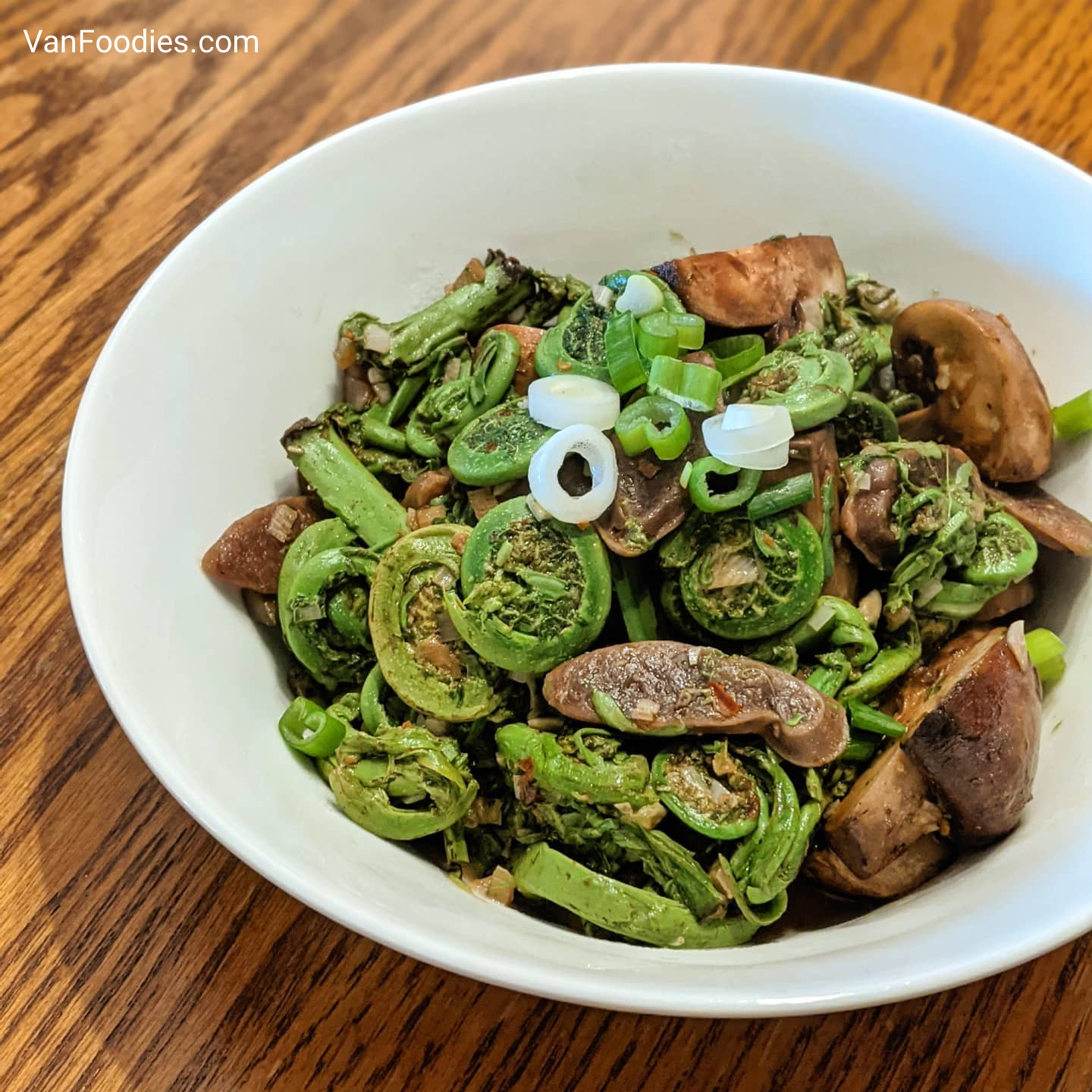 Fiddlehead Chinese Sausage Stir-fry: The trick to cooking fiddleheads is to make sure to boil/steam the fiddleheads before cooking. That is to avoid getting food-borne illness from raw fiddleheads. Steam/boil the fiddleheads until tender, before stir-frying them. We stir-fried ours with some Chinese sausage and cremini mushrooms.