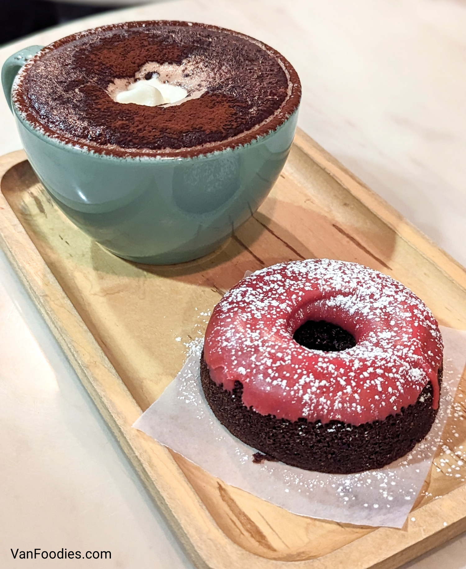 The Donut was definitely my favourite of the two. The texture of the chocolate cake was great, moist with nice crumbs. The tartness in the raspberry icing of the chocolate cake felt more balanced overall as a pairing. You can also taste the sea salt and savoury taste in the cream cheese topping in the hot chocolate. Even though it’s $11, there seems to be more in the offering than Raincouver, in my opinion.