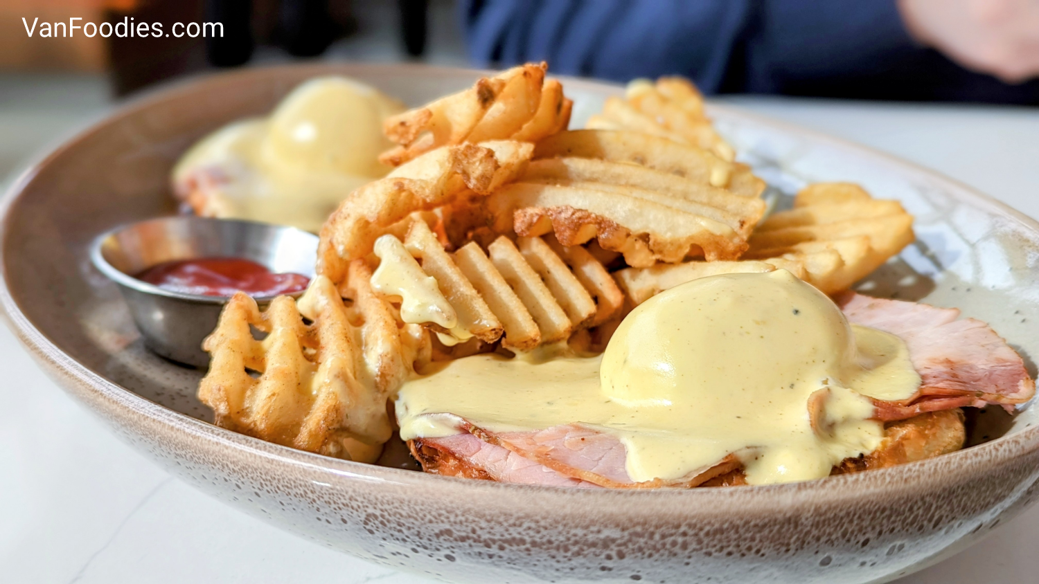 Mr. chose the Traditional Eggs Benny, and he liked it. Again, poached eggs were perfect in the cooking and shape. Mr. picked the artisan-style rosemary ham and there was a substantial amount of it. Love that the eggs benny is served on a crispy butter croissant so it’s more decadent. We substituted the herb potatoes with waffle fries and they were great.