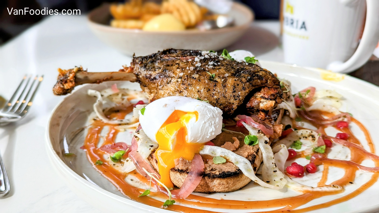 Duck Confit (under Not So Tini Crostinis) is available at certain locations only and it’s available here in Langley. It’s the whole confit duck leg sitting on top of a slice of French rye toast, two poached eggs, chestnut paste and a spicy caramel sauce. They nailed the cooking of the poached eggs, perfectly medium with lots of gooey egg yolk. The duck leg was nice and crispy on the outside, and the meat was moist and juicy inside. Personally we didn’t like the use of chestnut on the toast because it’s too sweet for our liking, especially combined with the spicy caramel sauce. However, overall, this was such a succulent brunch dish and reasonably priced at $23.