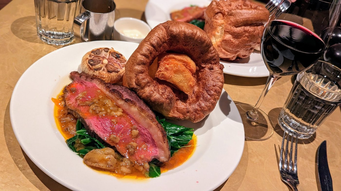 For £27 per person, we got this beautiful plate of slow roast rump cooked to a perfect medium pink (you have a choice of pink or well done), and it comes with crispy beef dripping roast potatoes, the biggest Yorkshire pudding I’ve ever seen, carrots, greens, roasted garlic and a luscious bone marrow and onion gravy.