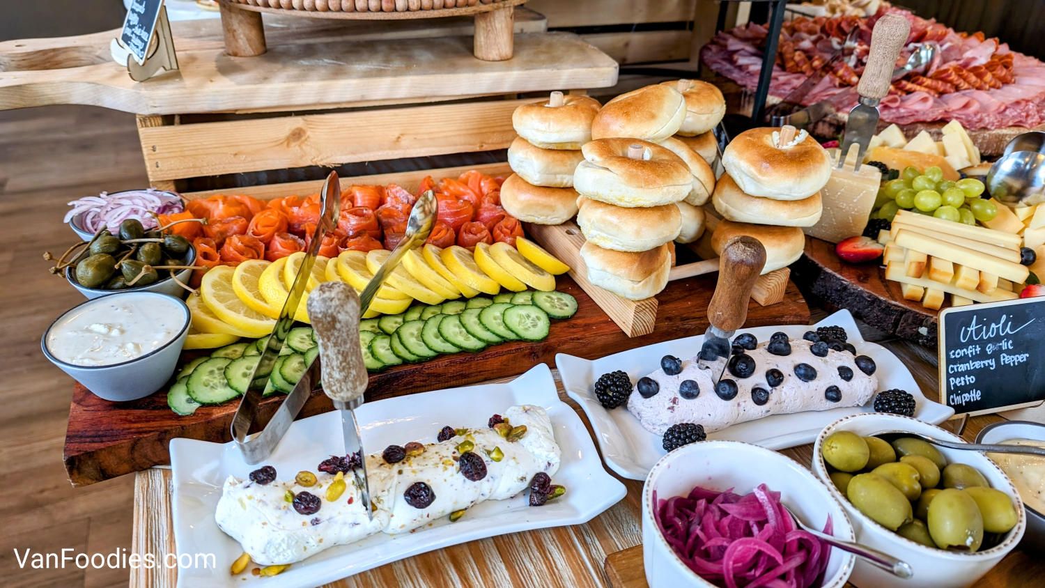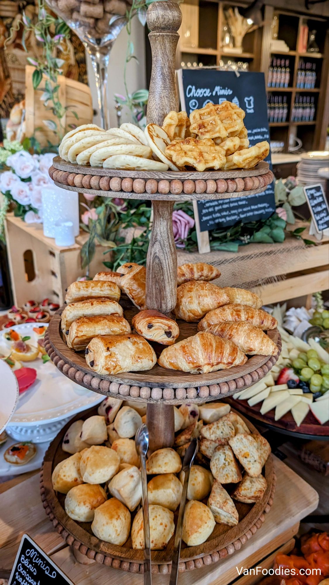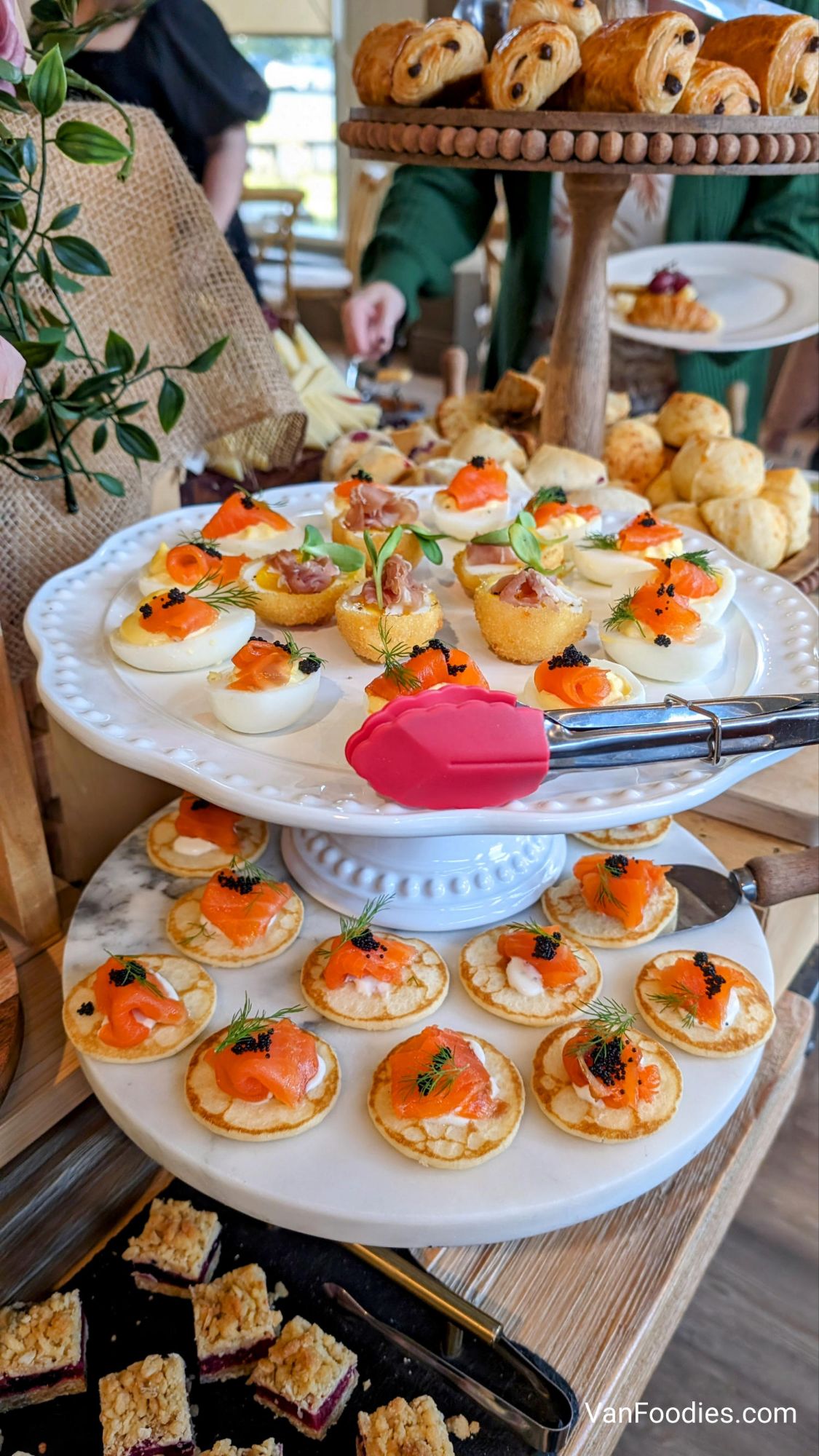 When we arrived, we were already impressed. They have turned their tasting room into the dining room, with the buffet stations set up in the corner. The food looked cute and dainty, and the team arranged it beautifully and colourfully. My eyes were drawn to the lox bagel station, the giant charcuterie platter and multiple displays of cheese, as well as miniature cakes and pastries that I knew I would be loading up my plate with.