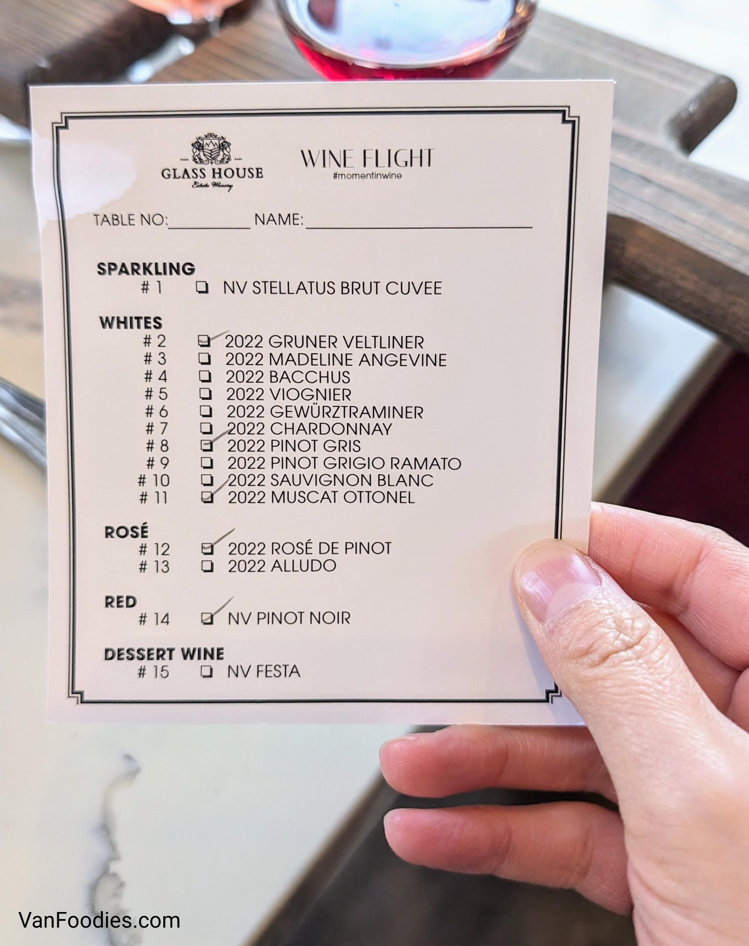 Towards the end, because we were having such a good time, I ordered an additional glass of the 2022 Gewurztraminer ($9.50 for 6oz); KK also ordered a glass of wine and IY ordered a different flight of wine (five 2oz pours for $20). And for the a la carte wine flight, you get to choose from their full list of available wines. Overall I found their wines to be on the drier side, even the Pinot Gris, Gewurztraminer and Muscat were not as sweet as some other BC ones I’ve had. I liked the Rose de Pinot the most so I took home a bottle ($32).