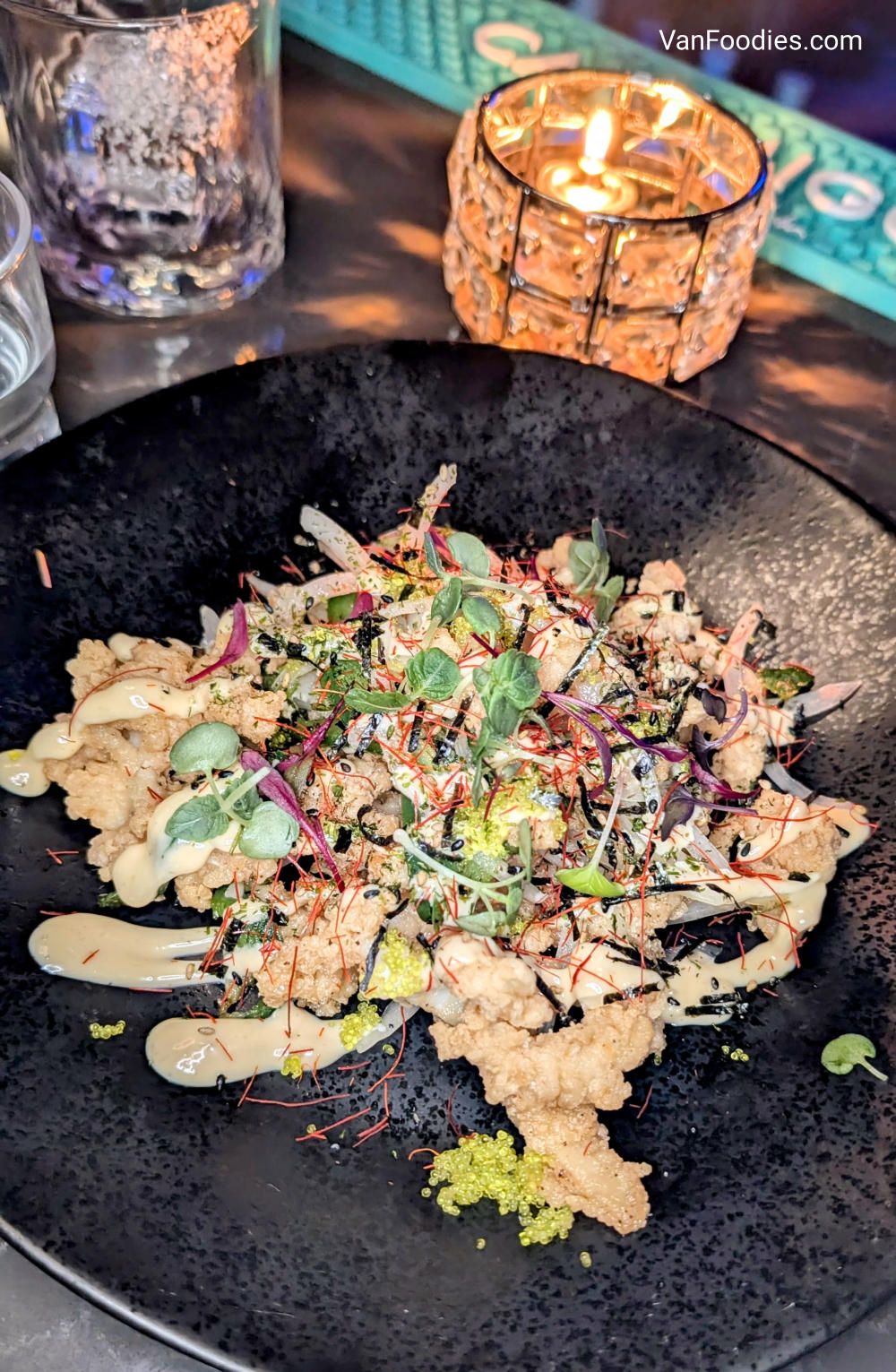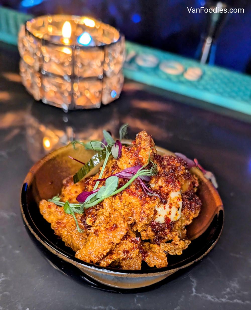Onto the warm dishes, we had Fire Torched Fried Chicken. On the menu it’s listed as table-side fire torched, but it wasn’t the case at this preview. We only got to sample a couple of pieces of the fried chicken, but let me tell you, they were juicy and flavourful, and I liked the duck fat chili caramel glaze. The other warm dish was Calamari. Thin strips of calamari were crispy, not overly dressed by the aioli. I would’ve liked a bit less batter to squid, but it’s a good dish overall.