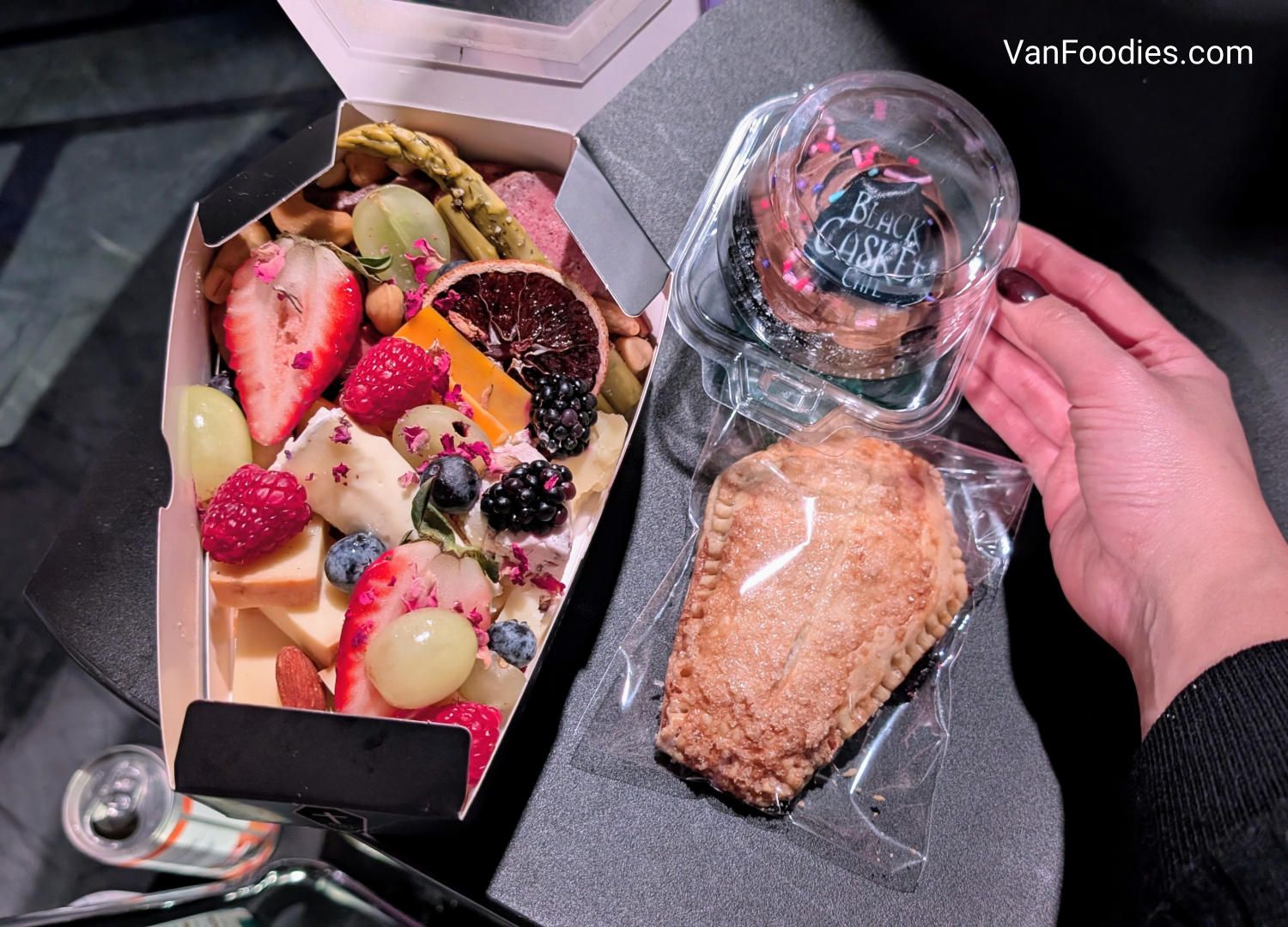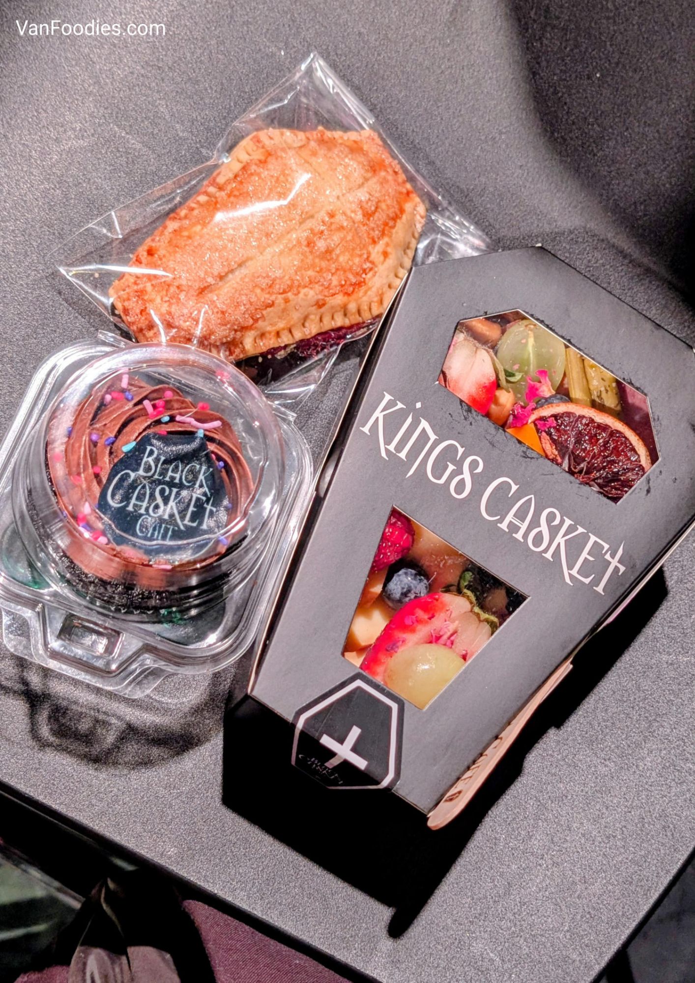 Each $90 ticket (includes taxes and fees) includes a charcuterie box from the Black Casket Cafe and the casket-shaped box was chef’s kiss. I learned that the cafe works with a local butcher, Sumas Meats, to source their meat, and I always appreciate local collaborations. The charcuterie casket was loaded with a wide variety of cheese and meat and crackers — I was expecting a snack-sized box, but it was a meal. I think it’s a really good value.