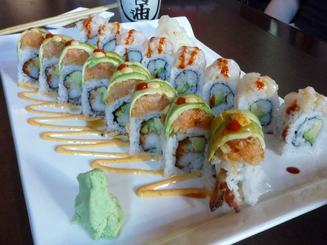 (Front) Summer Roll – Prawn tempura, masago, and cucumber, topped with tuna crunch avocado, sweet soy and spicy mayo.