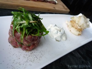 Duck Tartare, pickled garlic yogurt, fried onion rings
